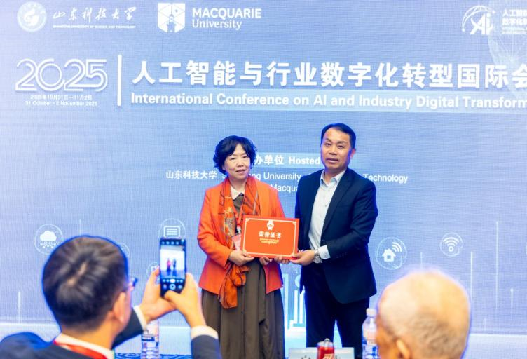 10月31日至11月2日,山东科技大学联合澳大利亚麦考瑞大学主办的“2025人工智能与行业数字化转型国际会议”在青岛隆重举行。本次会议吸引了来自澳大利亚、美国、英国、新西兰等7个国家和71所高校的280余位专家学者与业界精英,聚焦AI驱动的行业数字化转型,设有1个主论坛、3个特约报告论坛及12个平行分论坛。财经学院举办的“人工智能驱动下的金融、保险与公共治理创新”特约报告论坛于11月1日下午举行,20余位金融、保险、风险管理和经济学领域专家参与。本次特约报告论坛由此次国际会议执行主席路英教授发起,并与财经学院共同组织,财经学院院长刘庆志到会并为特约嘉宾颁发荣誉证书。副院长主父海英教授主持会议,金融和保险专业相关教师、研究生参会。